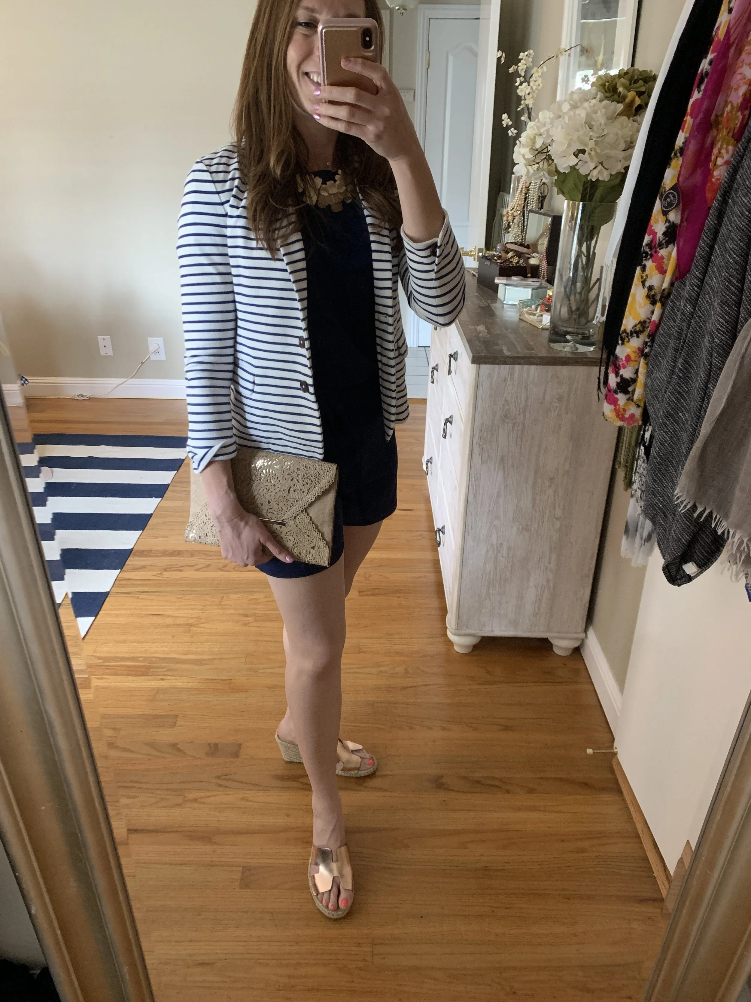 The second item was another shorts romper, but in a solid blue with a belted waist. This one was SUPER flattering. The bottom isn’t super fitted, but it is decently high waisted and gives a nice slimming effect. I really liked this one. I paired it alone with a simple pair of white Steve Madden sandals and then again with a striped blue J.Crew blazer, rose gold shoes and matching bag and necklace. This is a keep! It is so vertatile and so incredible comfortable and the price! Gah! Amazon kills me with deals!